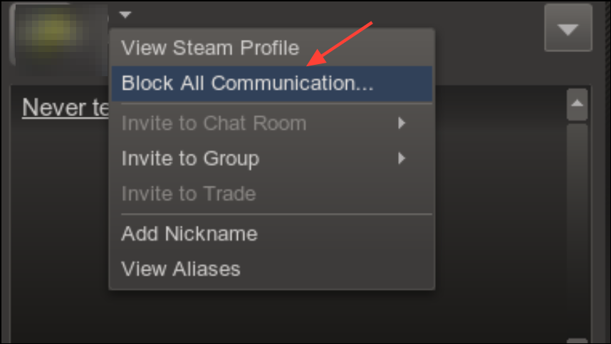 Step 2: On their profile, click the "More" button (usually represented by three dots) and select "Block All Communication." This action temporarily blocks the user, which resets certain flags in Steam's system.
