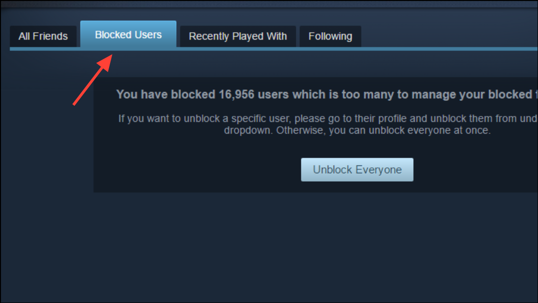 Step 2: Click your username in the top navigation, then select "Friends." Choose the "Blocked users" tab to see users you have blocked.