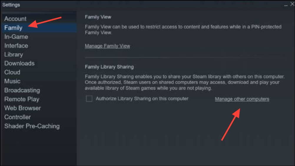 Step 3: Uncheck or deauthorize all PCs if Family Sharing is enabled. This can resolve rare conflicts that block friend requests.