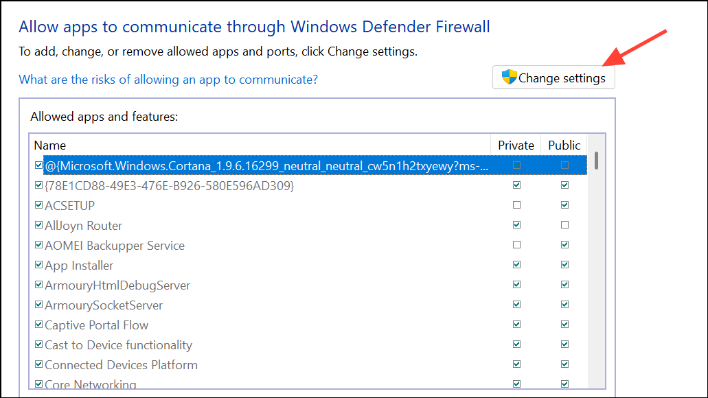 Step 3: Click Change settings, then locate and check both Steam and the affected game for both private and public networks.