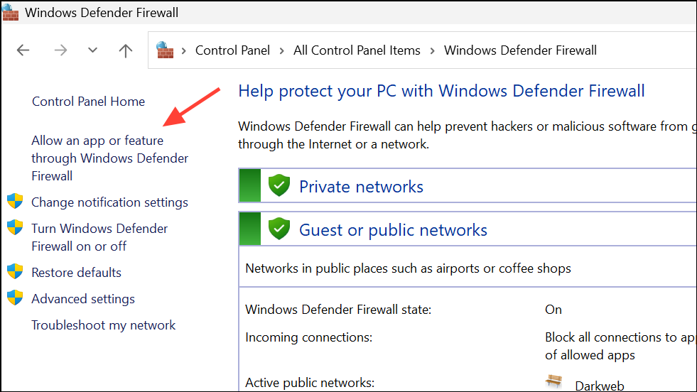 Step 2: Click Allow an app or feature through Windows Defender Firewall.