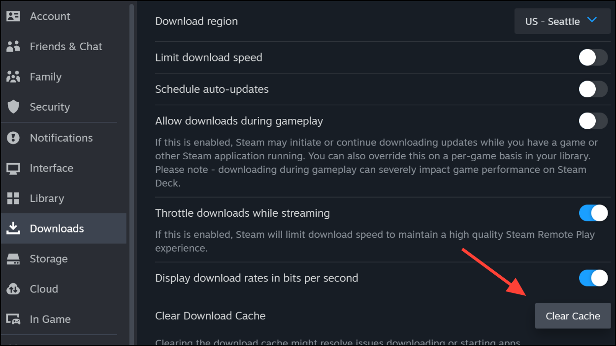 Step 3: Click CLEAR DOWNLOAD CACHE and confirm when prompted. Steam will log you out, so have your credentials ready to sign back in.