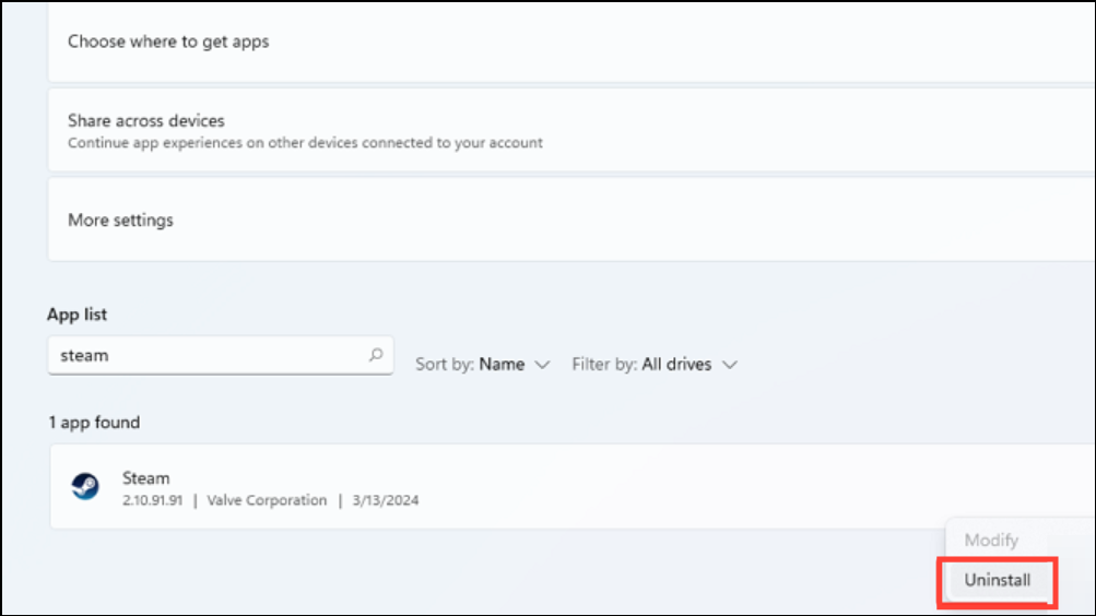 Step 3: Open Settings > Apps > Installed apps, find Steam, and select Uninstall. Remove any remaining Steam folders manually.