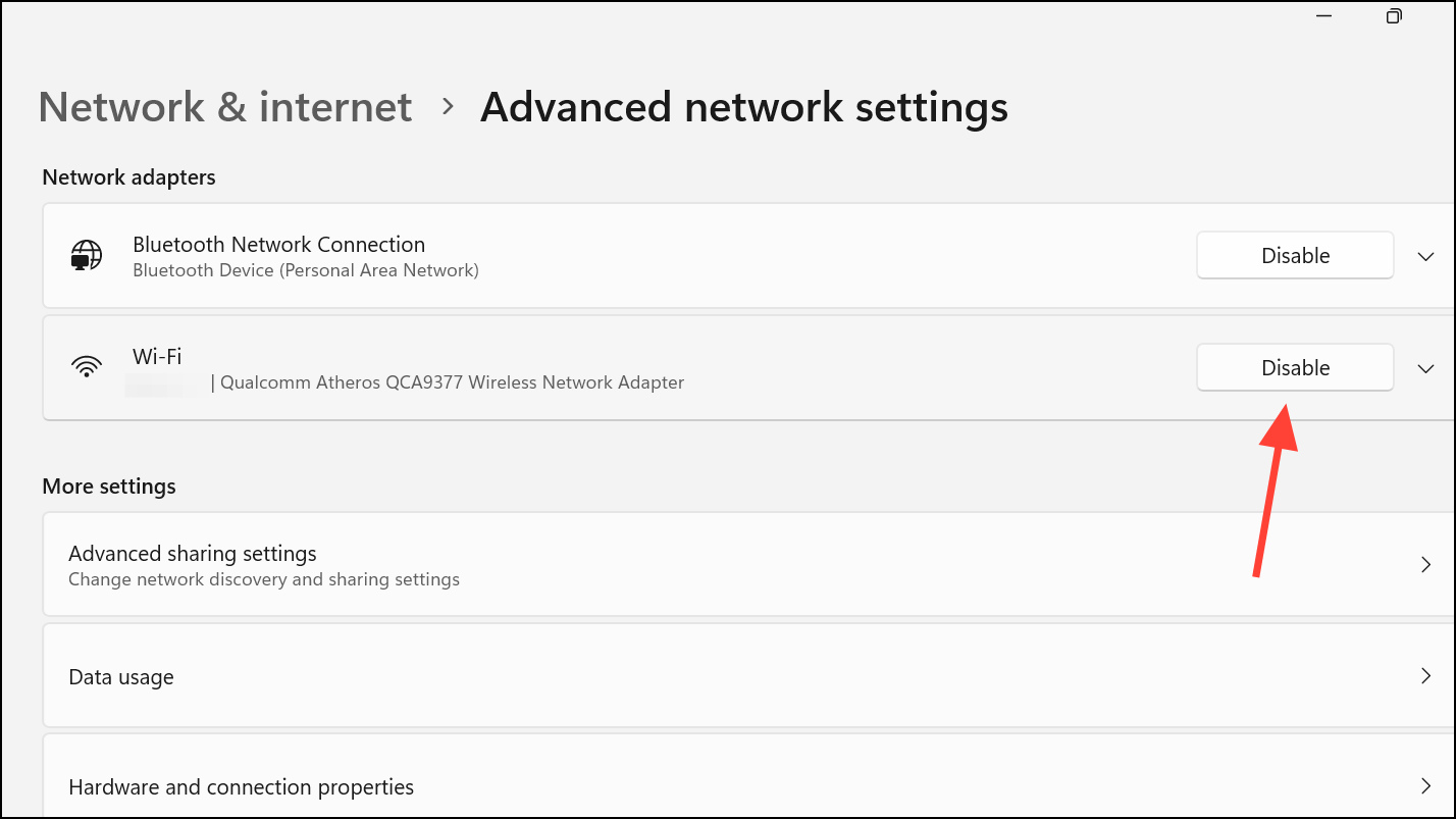 Step 2: Under Network adapters, select your active adapter (Wi-Fi or Ethernet), click Disable, wait a few seconds, then click Enable.