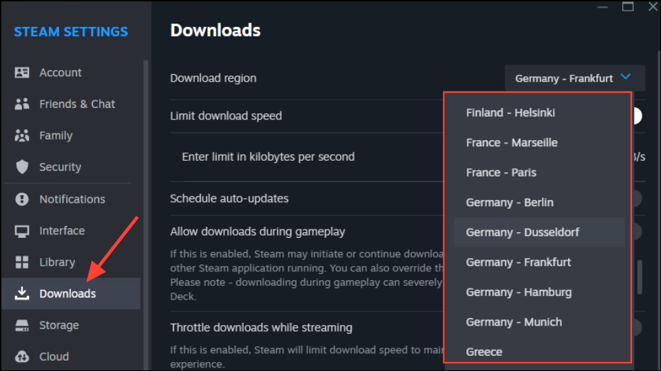 Step 1: Change your Steam download region in the client’s settings. While this rarely bypasses a true server-side outage, it can help in cases where only certain regions or CDNs are overloaded. To do this, go to Steam > Settings > Downloads > Download Region and select a different nearby region.