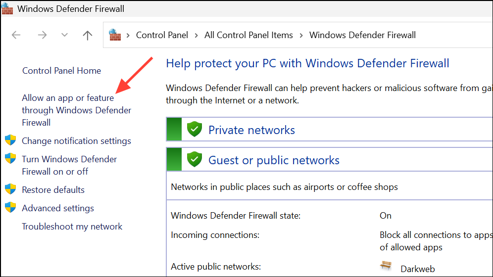 Step 2: Click Allow an app or feature through Windows Defender Firewall.