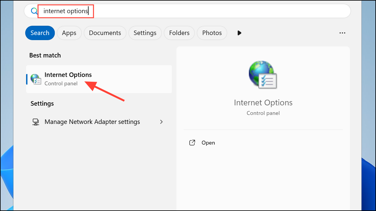Step 1: Open Windows Internet Options by searching for it in the Start menu.
