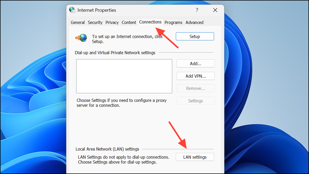 Step 2: Go to the Connections tab and click LAN settings.