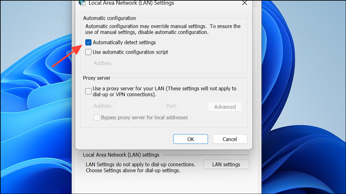 Step 3: Uncheck Automatically detect settings and ensure no proxy server is enabled unless required by your network.
