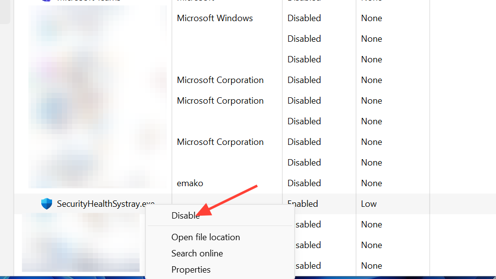- Identifying a single culprit (for example, SecurityHealthSysTray or other background tools) and leaving only that item disabled.