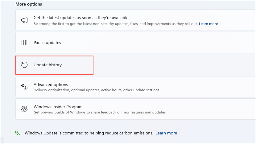 - On the Windows Update page, click on 'Update History'