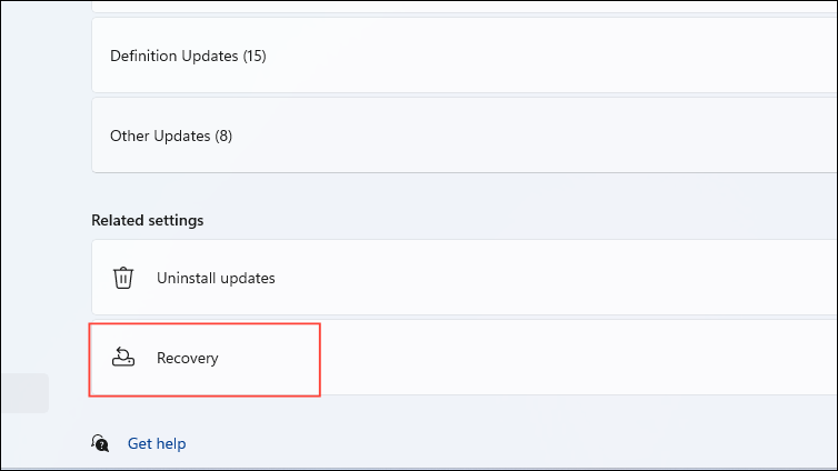 - Here you will see all recently installed updates on your system. Scroll down to the 'Related Settings' section and click on 'Recovery'.