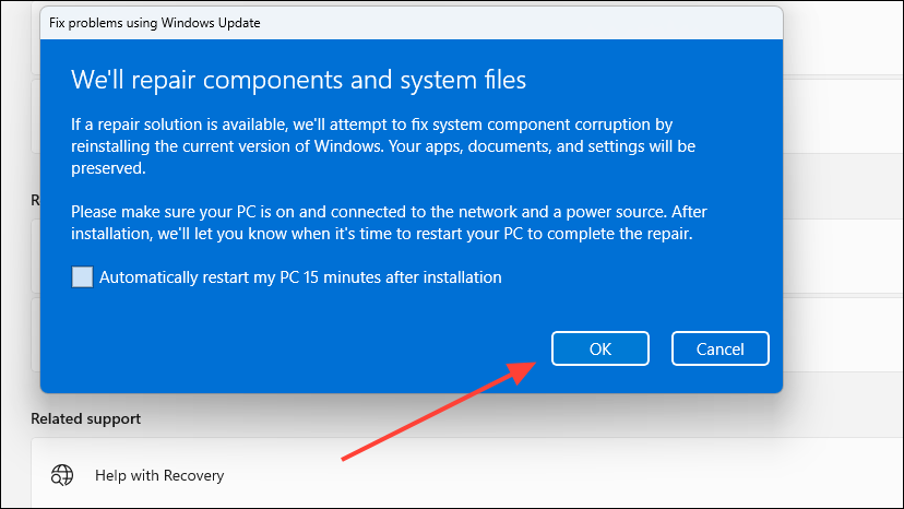 - You will get a pop-up informing you that Windows will try to repair your system components and files. The process will also include reinstalling updates that were not installed properly. Click on the 'OK' button to proceed.