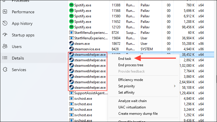 - Right-click on each of them and click on 'End Task'. If you find multiple instances of the steamwebhelper.exe process, end all fo them.