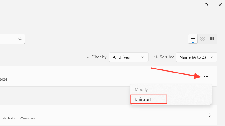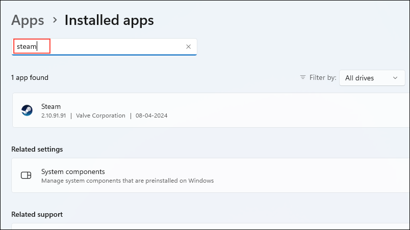 - When Steam appears in the search results, click on the three dots on the right and then on 'Uninstall'.
