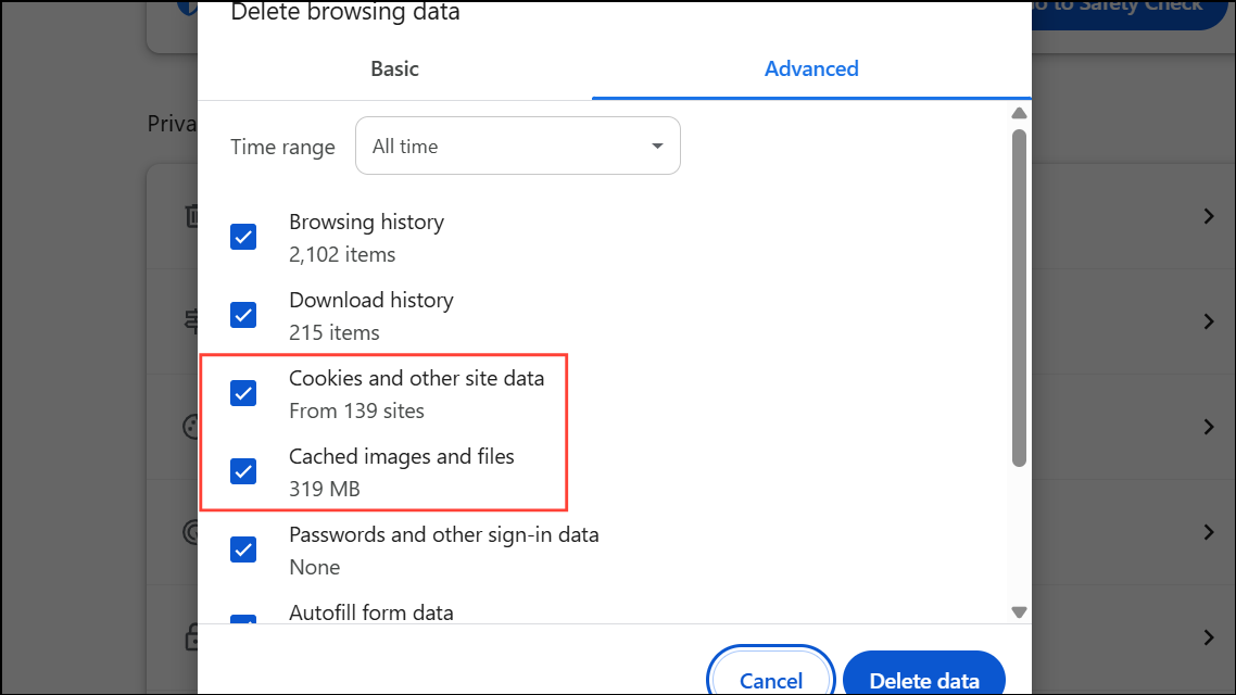 Step 1: In Chrome, click the three-dot menu, select Settings, go to Privacy and Security, then choose Delete browsing data.