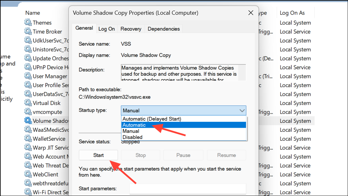 Step 3: Ensure each is set to Automatic and running. Right-click any stopped service and select Start.