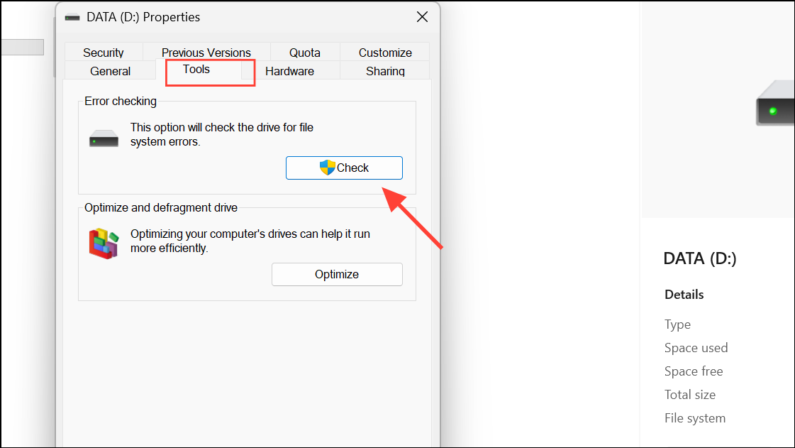 Step 2: In File Explorer, right-click the drive, choose Properties > Tools > Error Checking, and scan for problems. If issues persist, back up any data, then reformat the drive as NTFS to resolve potential corruption or permission problems.