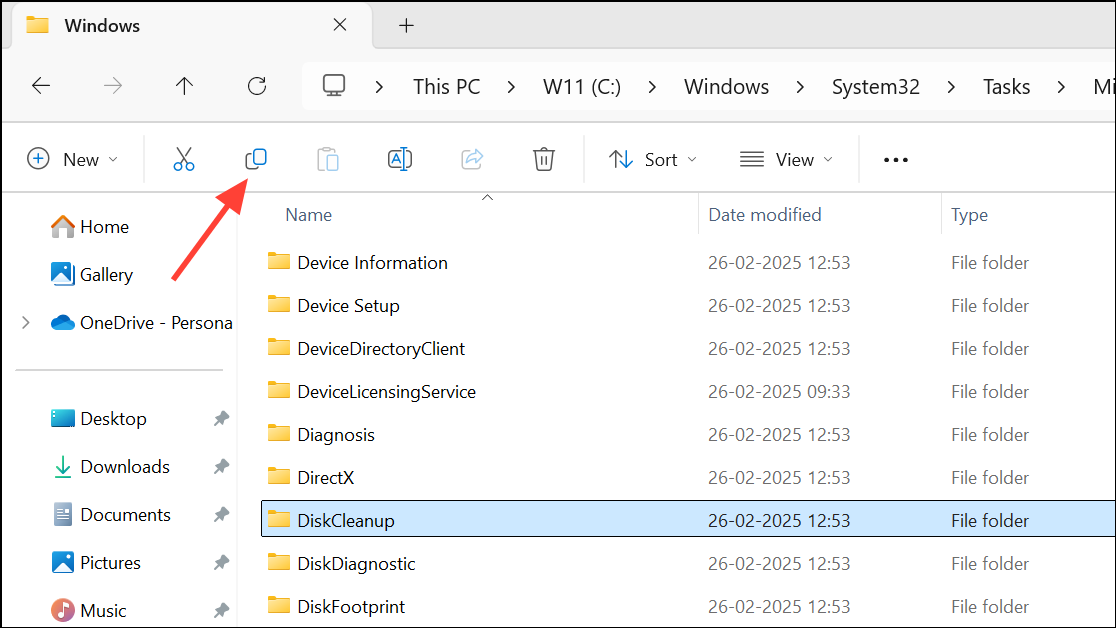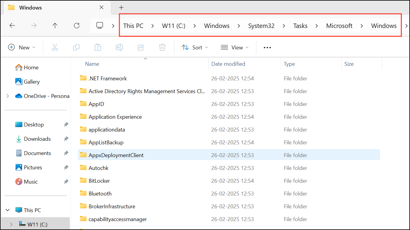 Step 1: Open File Explorer and navigate to the system tasks directory. Enter C:\Windows\System32\Tasks\Microsoft\Windows in the address bar and press Enter. This location contains the XML files for all scheduled tasks.
