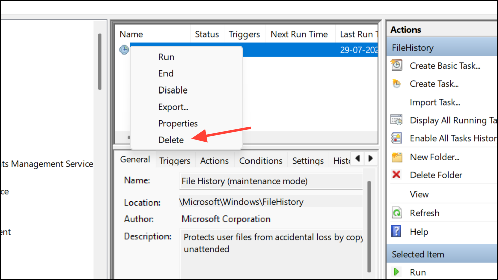 Step 3: Right-click the corrupted task (for example, AutomaticBackup or Windows Backup Monitor) and select "Delete." This removes the task from Task Scheduler and the underlying system folder.