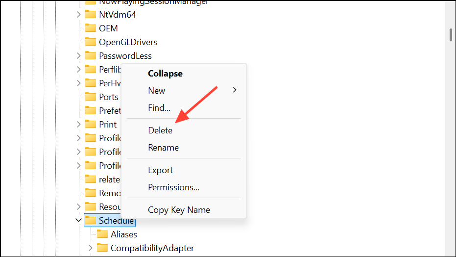 Step 3: Right-click the Schedule key and select "Delete." Confirm the action. This removes all task definitions from the registry.