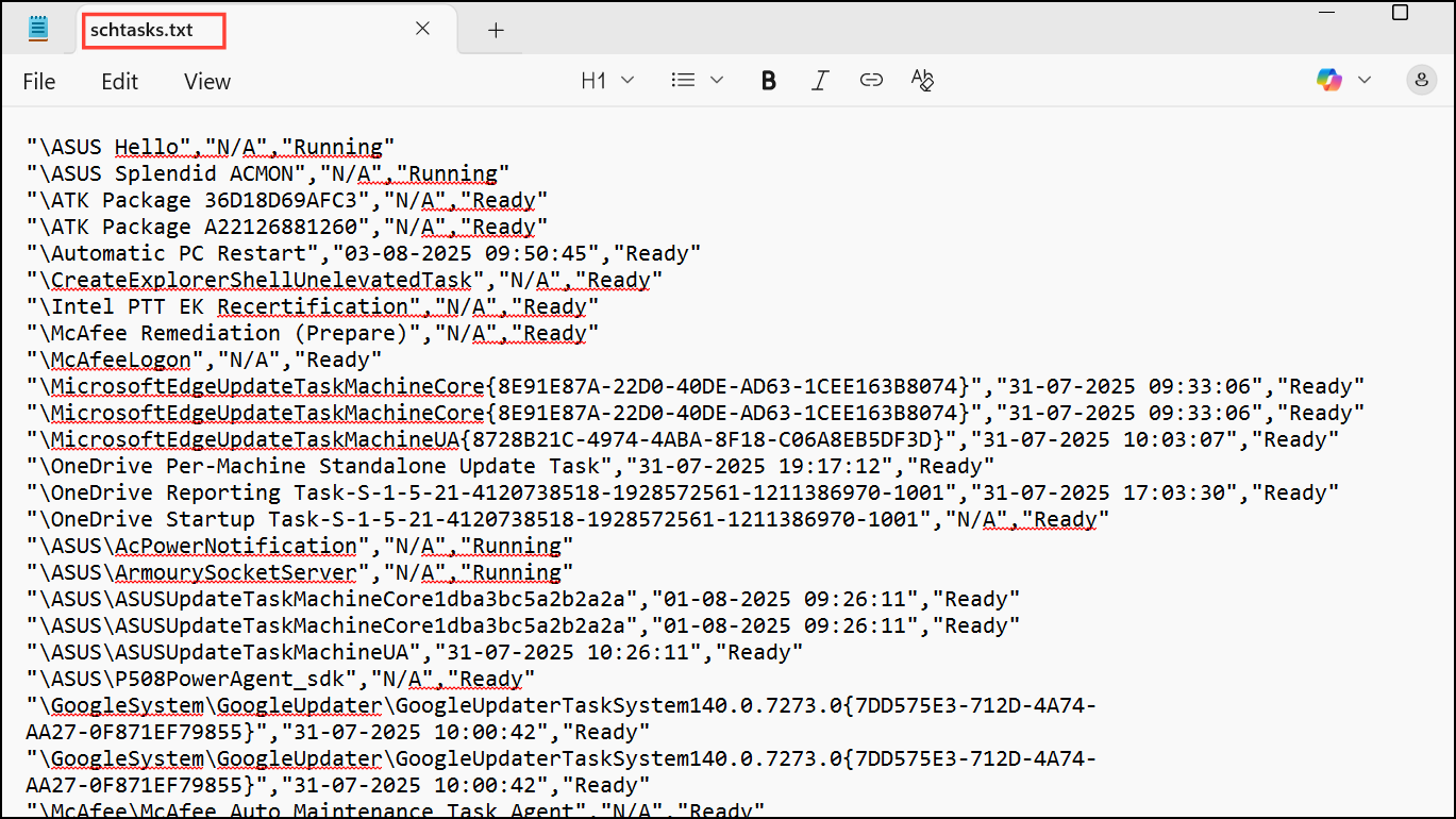 schtasks /query /nh /fo csv > %userprofile%\Desktop\schtasks.txt