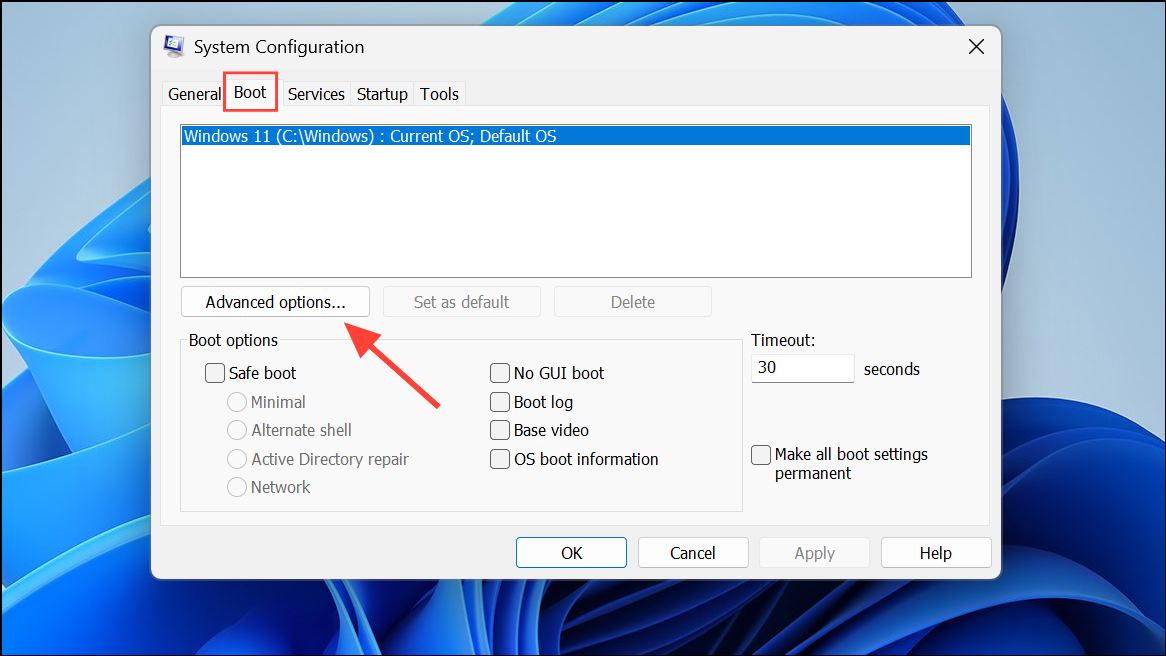 Step 2: In the System Configuration window, select the Boot tab. Click the Advanced options… button to access advanced boot settings.