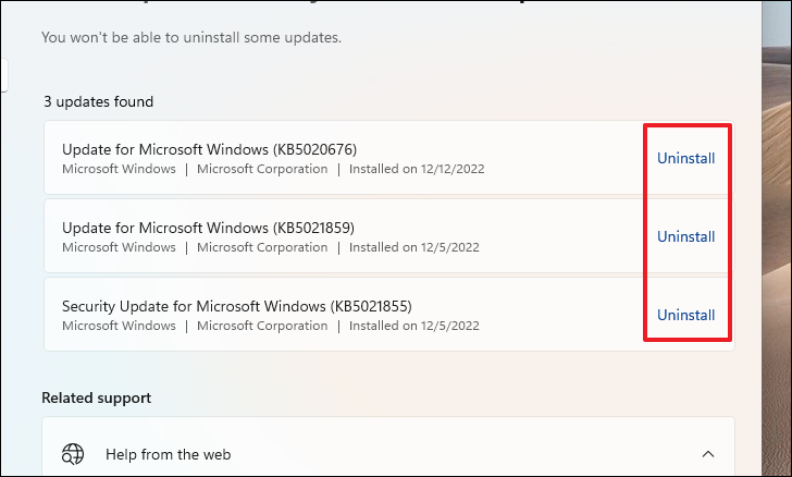 - Choose the most recent update and click Uninstall. Confirm any prompts to proceed.