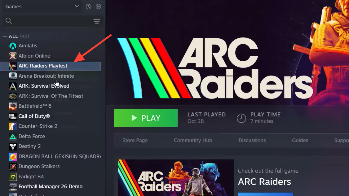 Step 1: Open your Steam library and navigate to ARC Raiders. Select the game to open its detail page.