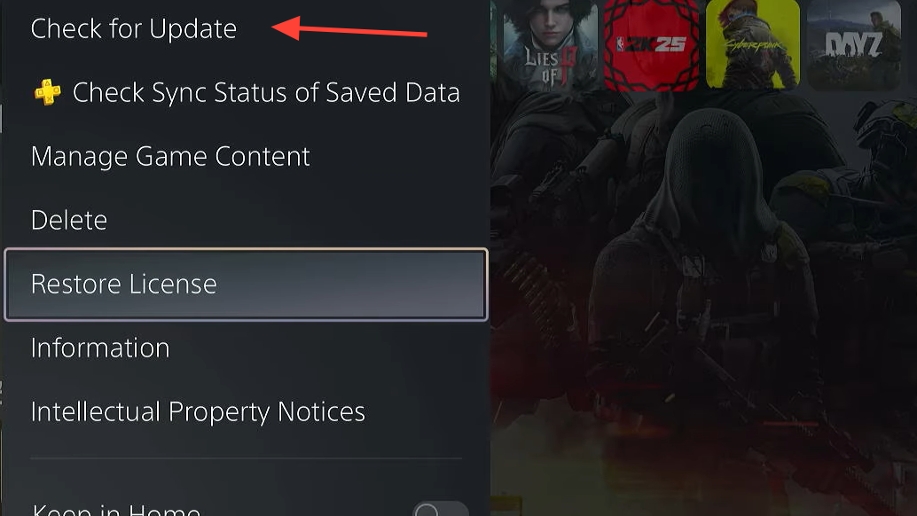 Step 2: Press the Options button on your controller and select "Check for Updates" from the context menu.