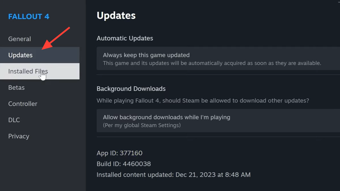Step 2: Click "Properties" from the game's menu, then go to the "Installed Files" section.