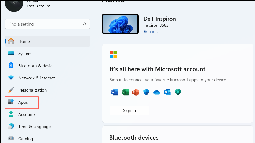 Win + Ishortcut and click on 'Apps' on the left.