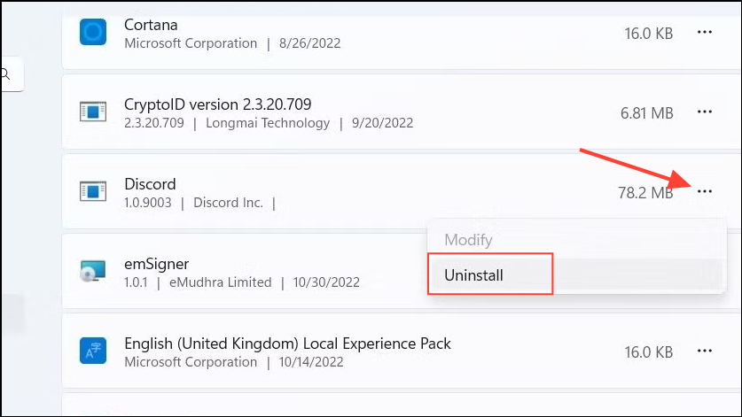 - A list of all installed programs will appear on your screen. Click on the three dots on the right of the Discord app and click on 'Uninstall' to remove it.
