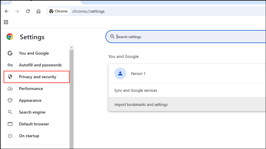 - On the Settings page, click on 'Privacy and Security' on the left.