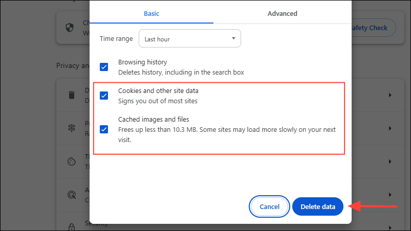 - Now, click on the 'Cookies and other site data' and 'Cached images and files' checkboxes to select them, and use the dropdown menu at the top to select the time range for which you want to clear the cache. Then click on the 'Delete data' button.