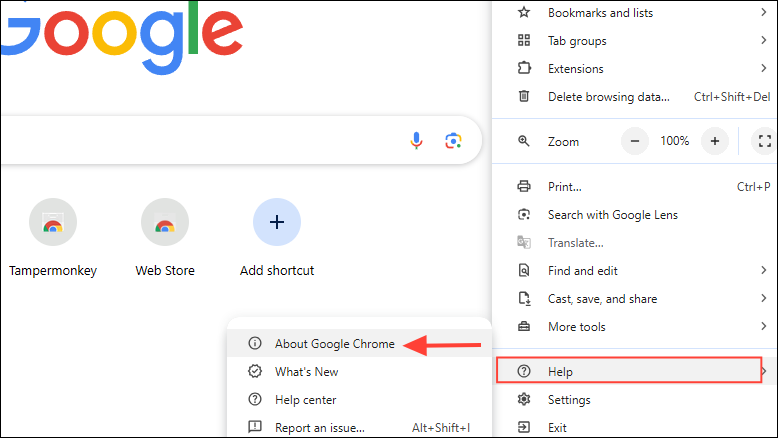 - Click on the three dots at the top right in Chrome and go to 'Help' before clicking on 'About Google Chrome'.