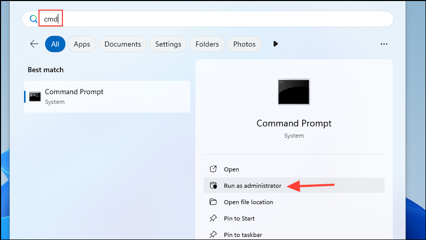 cmdand click on 'Run as administrator'.