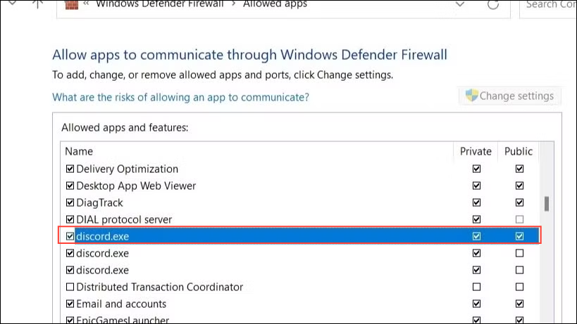 - Look for 'discord.exe' in the list of apps and check that both 'Private' and 'Public' checkboxes are checked. Click on them if they are not enabled to turn them on and then click on the 'Save changes' button.