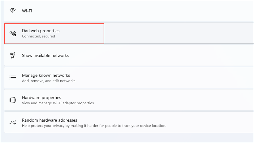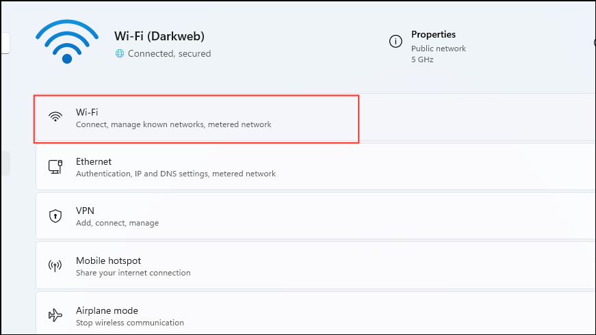 - Click on the properties option for the Wi-Fi connection.