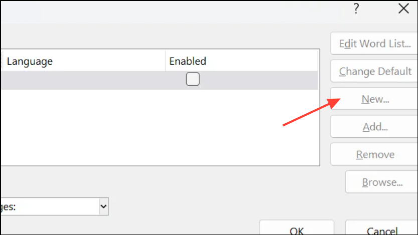 Step 2: In the Custom Dictionaries dialog, select New to create a fresh custom dictionary. Name the new dictionary and save it in the suggested location. This step replaces a potentially corrupted or inaccessible dictionary file, restoring the ability to add and update words.