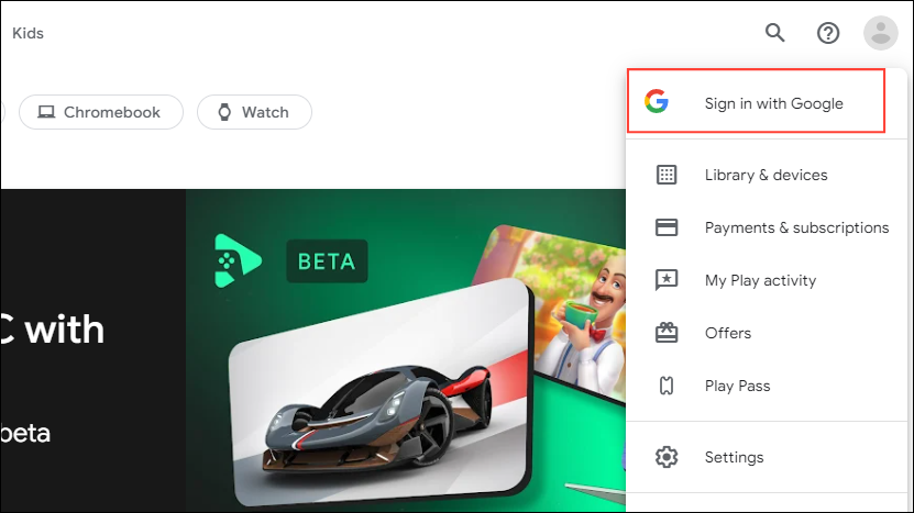 - Visit the Google Play Store webpage on your desktop and click on the account icon on the top right and then on 'Sign in with Google'.