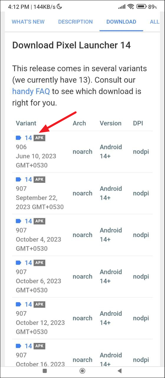 - You will see a list of all the available APKs for that app. Tap on one to view available downloads.