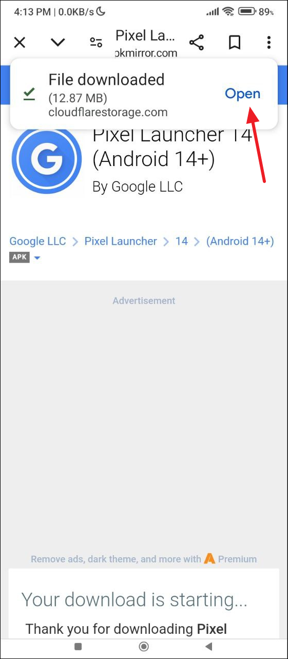- Once it is downloaded, tap on 'Open' to install it. You will have to grant permission before you can install the APK on your device.