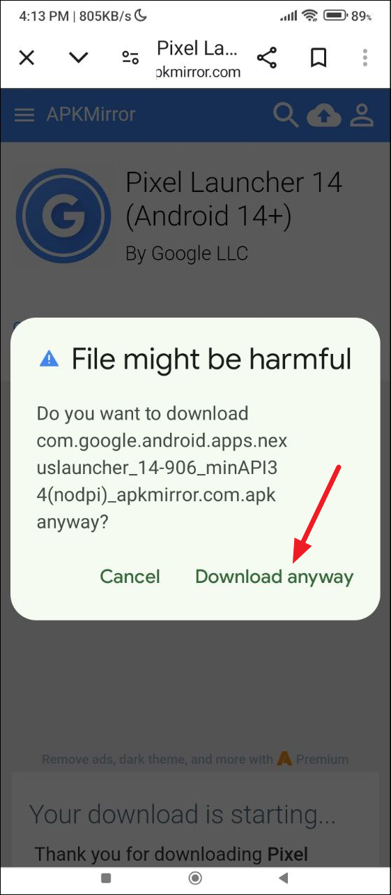 - You will see a warning that the file might be harmful. Tap on 'Download anyway' to proceed with the download.
