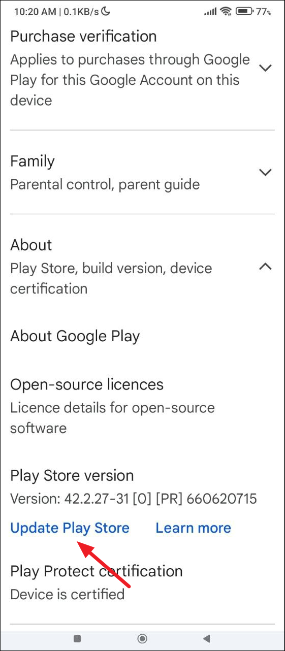 - Then tap on 'Update Play Store'. If an update is available, it will be downloaded and installed automatically.