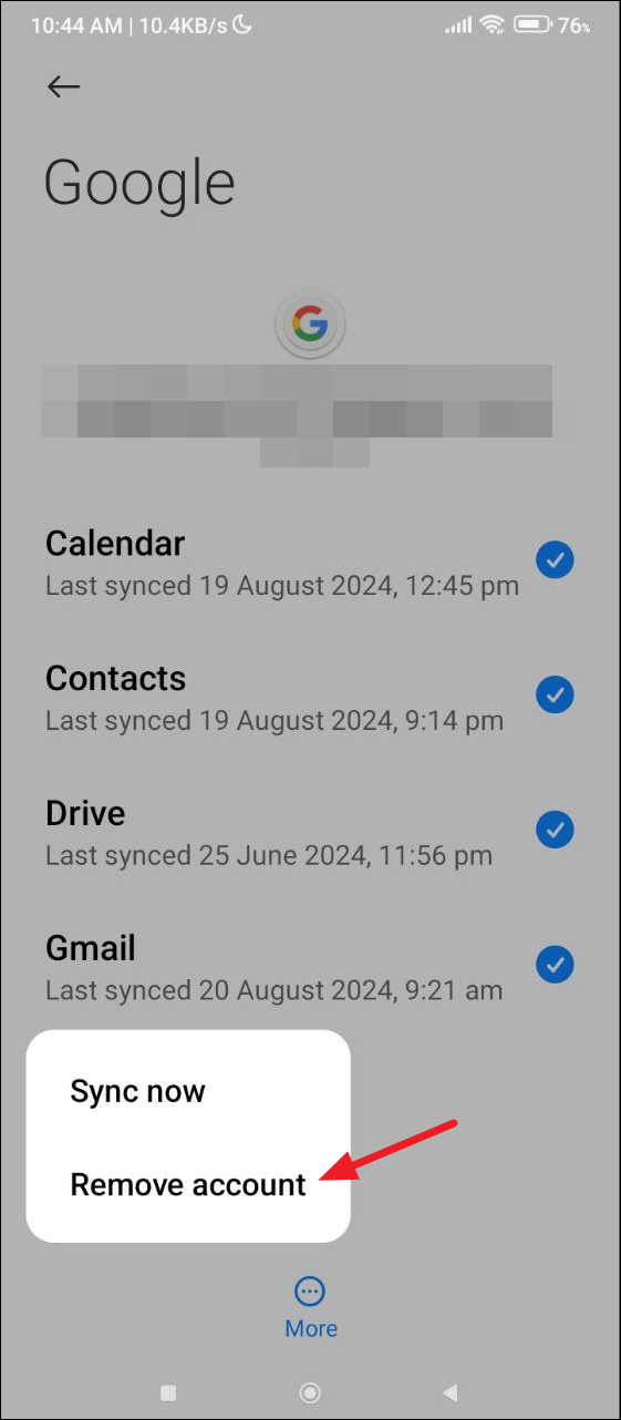 - Finally, tap on 'Remove account' to remove your account from the device before rebooting it.