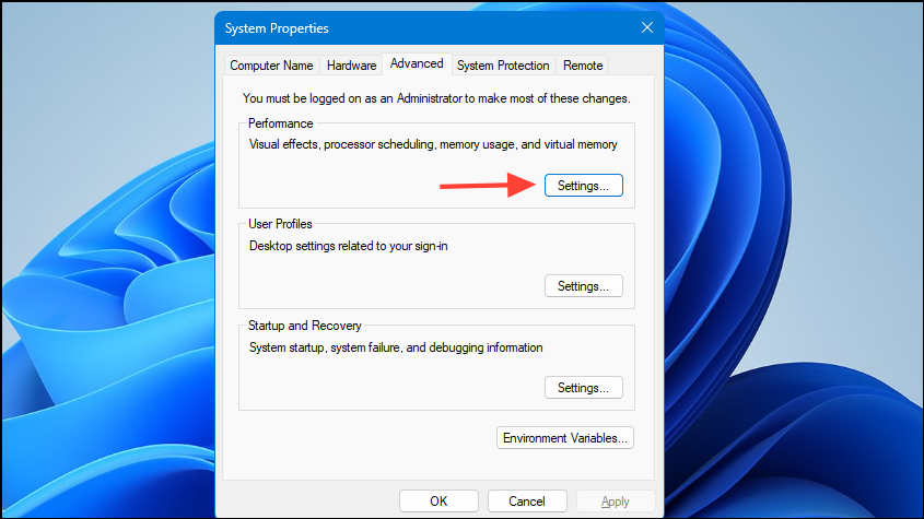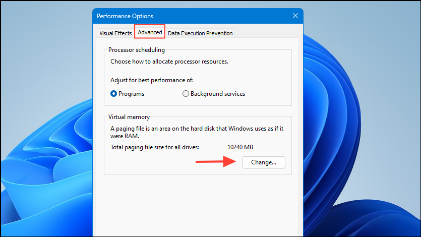- Switch to the Advanced tab and click Change under Virtual memory.