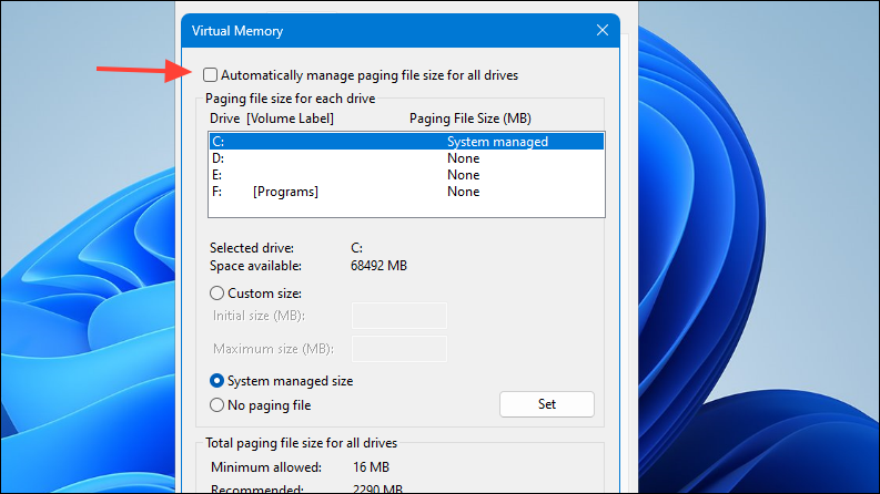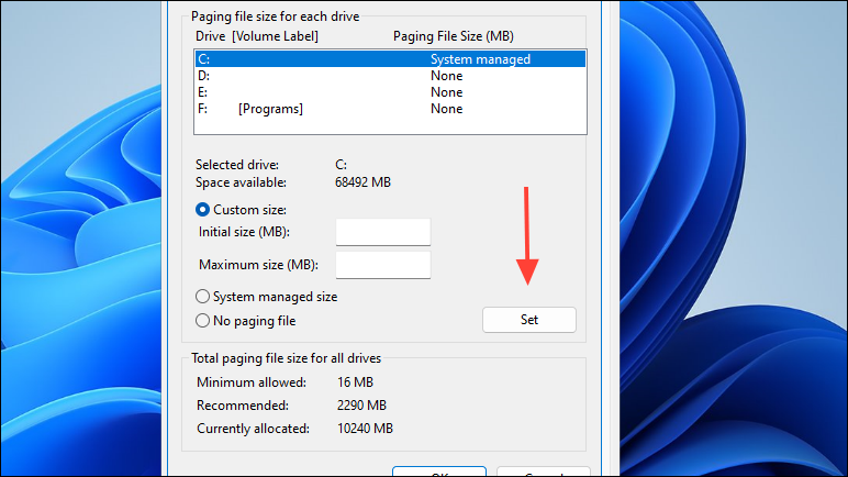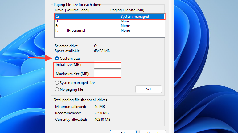- Select your system drive (usually C:), choose Custom size, and enter initial and maximum sizes (in MB).
