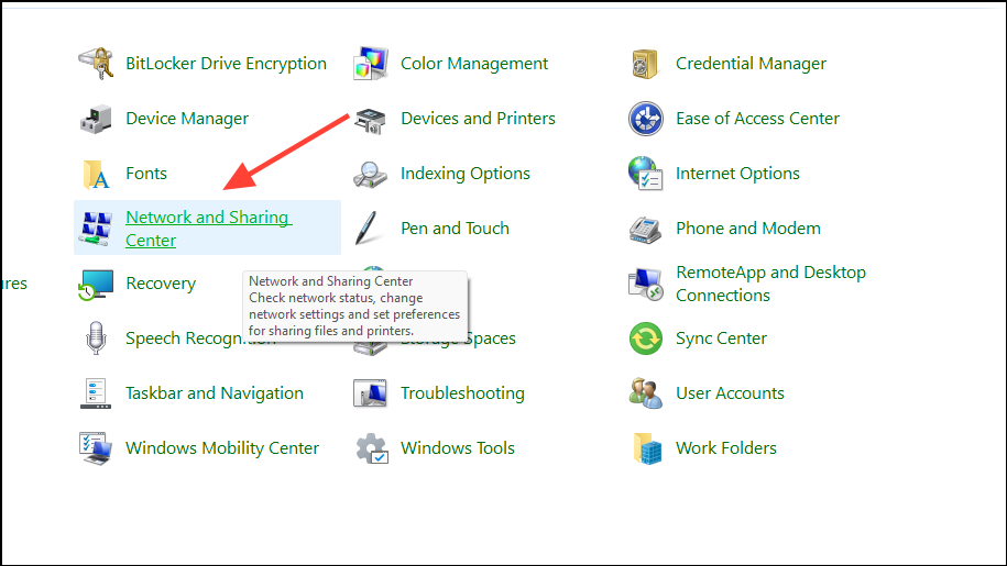 - Open the Control Panel and click on the 'Network and Sharing Center' option.