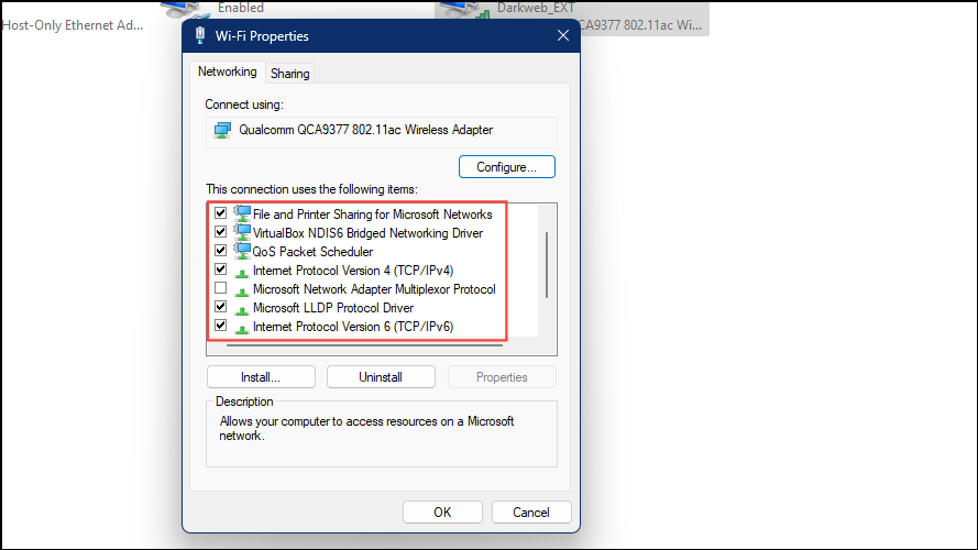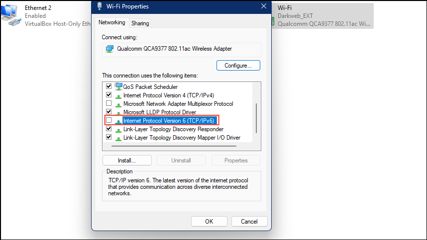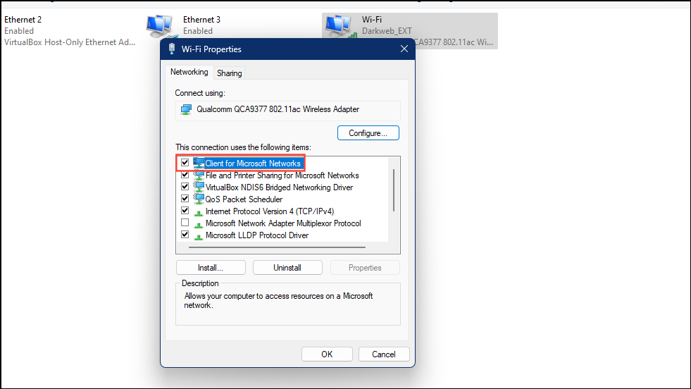 - Do the same for 'File And Printer Sharing For Microsoft Networks', 'Internet Protocol Version 4 (TCP/IPv4)', 'Internet Protocol Version 6 (TCP/IPv6)', and 'Link-layer Topology Discovery Responder'.